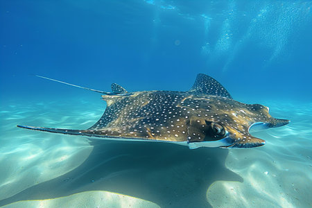 A majestic spotted eagle ray glides gracefully over a pristine white sandy seabed, bathed in tranquil turquoise waters. Its spotted pattern contrasts beautifully with the bright sand.