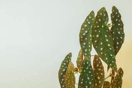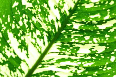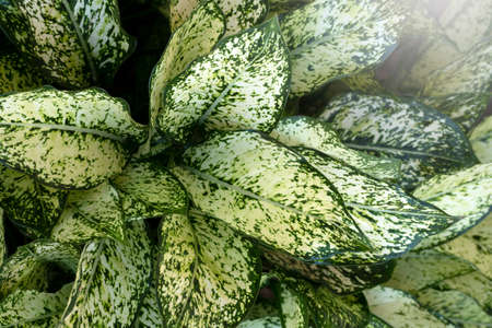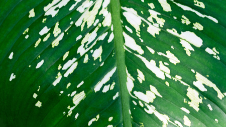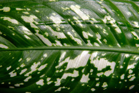 Close up of dieffenbachia leaf. Natural background. Dark green leaves with white spots, macro view. Fresh houseplant.