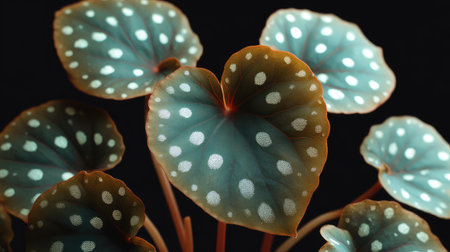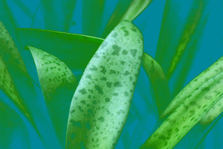top view macro exotic tropical botanical background blue neon light emerald dark green tiny leaves plant pink line foliage.idea for wallpaper,leaf backdrop,natural website cover design.