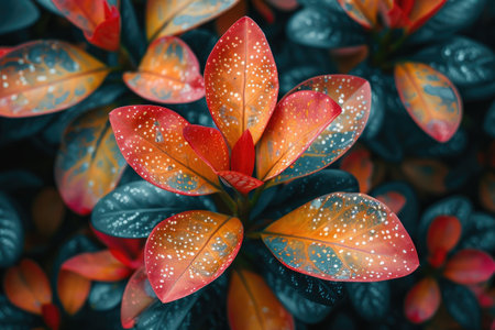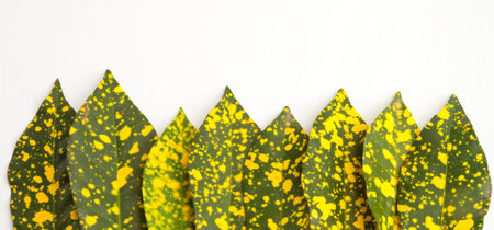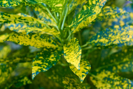 Croton (Codiaeum variegatum) tropical plant, close-up. Beautiful plants with varied foliage. Colorful Croton leaves background, top view
