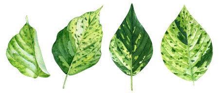 Watercolor illustration of the green spotted tropical leaves isolated on white background