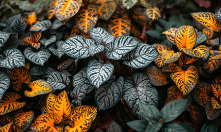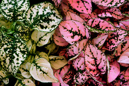 Variegated plants leaves background, green and pink variegated leaves background selective focus.