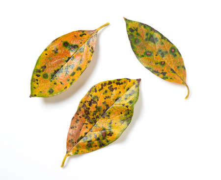 Pear leaf (upper side) with Pear rust - disease caused by Gymnosporangium sabinae fungus, close up, isolated on white background