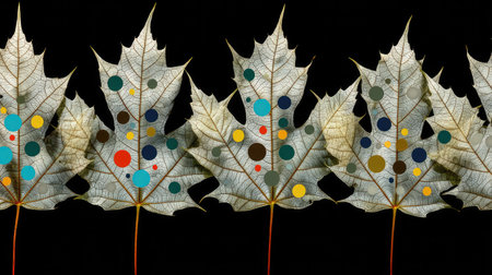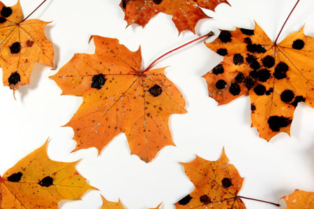 Yellow Maple leaves with black and white spots. Fungal disease or tar spot on maple leaf caused by Rhhytisma acerinum fungus