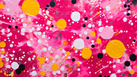 Abstract pattern with colorful bold shapes, spots and curves in yellow, red, pink, white and black, perfect for modern decor design.