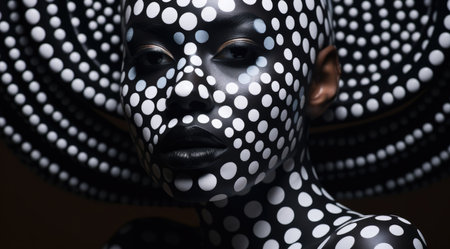 A striking portrait of a woman featuring vibrant abstract color dots and bokeh lighting effects, creating a modern art feel and captivating aesthetic.