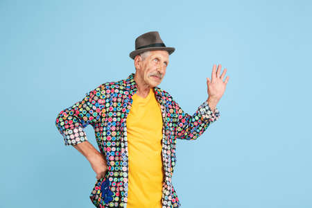 Cheerful greeting. Portrait of senior hipster man in stylish hat isolated on blue studio background. Tech and joyful elderly lifestyle concept. Trendy colors, forever youth. Copyspace for ad.