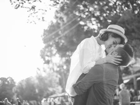 Close up of young couple in love woman man in casual warm clothes hugging kissing with sun behind on walk in autumn park outdoors in good weather. Love relationship family lifestyle. Black and white