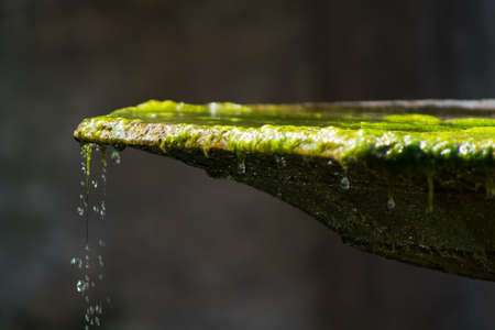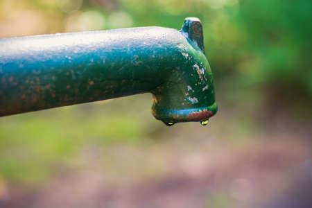 Manual old green and rusty water lever pump with water pouring out of the spout, last drop of water, drought. Blurred green background