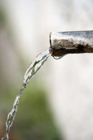 A stream of pristine water bursts from a rustic, corroded metal pipe, set against a gentle, blurry natural backdrop that emphasizes freshness and resilience.