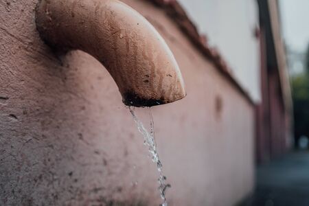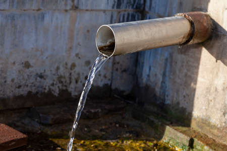 Close up view drain water flowing from the PVC pipe hole. Sanitary sewer concept. Transporting water from rain and houses for disposal. Rural environment sewage system. Selective focus on foreground.