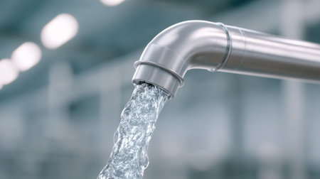 Close-up view of water flowing from a sleek metal pipe in an industrial setting, highlighting the movement and clarity of the liquid against a blurred background.