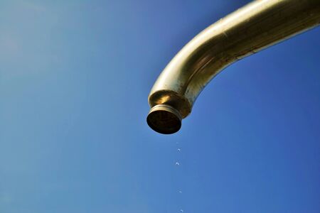Close up photograph of water flowing from silver metal pipe with dripping water droplets