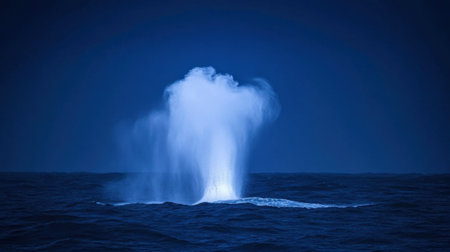 This captivating image captures a dramatic water eruption against a dark blue ocean backdrop, highlighted by gentle illumination, evoking the power of nature.