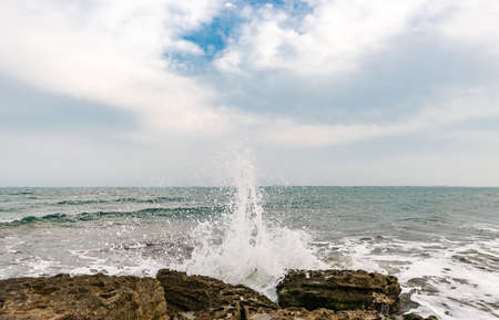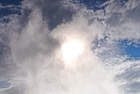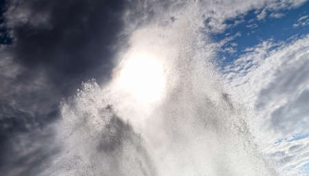 Beautiful fountain spray at sea blending in with stripes of clouds on blue sky