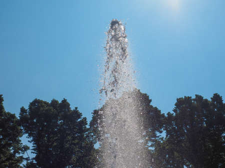 Single water column of the fountain rises high into the clear summer sky and crumbles into small splashes and drops. Sunny day.