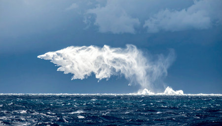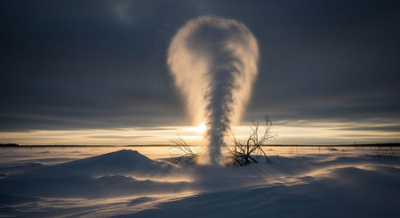 A colossal waterspout churns the frigid arctic ocean, its powerful vortex connecting the turbulent sea with the ominous sky above. This rare and dramatic display of natures raw power over a landscape of floating ice captures a moment of both terrifying beauty and immense force.