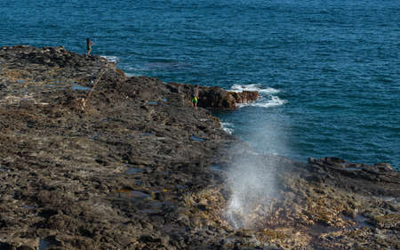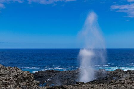 Atlantic ocean salt water blow hole, on volcanic rocks, with sunlight, ocean and blue sky background, in Charco Manso, El Hierro island, Canary Islands, Spain