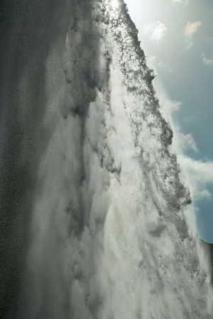 Low angle view showing a massive column of white water falling rapidly, scattering shiny droplets under bright sunlight, framed dramatically by dark green forested mountain slopes.