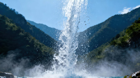Majestic water eruptions create spectacular splashes in a tranquil ocean setting, showcasing the beauty of nature under a bright sunlit sky.