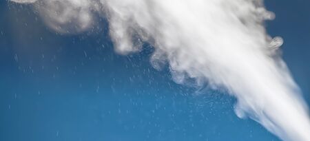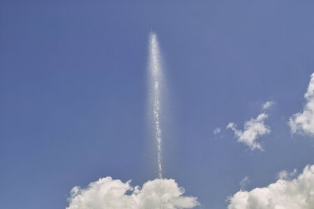 Single water column of the fountain rises high into the cloudy sky and crumbles into small splashes and drops. Summer sunny day.