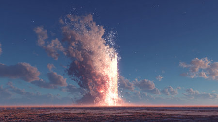 A colossal blast erupts from the depths of the ocean, sending a towering plume of smoke and water high into the sky. The raw power of the event is captured in the chaotic spray and churning sea, creating a dramatic and awe-inspiring spectacle of immense force.