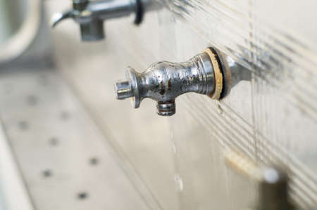 Close up photograph of water flowing from silver metal pipe with dripping water droplets