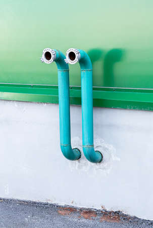 This image features a striking blue tiled wall with two metallic pipes mounted symmetrically, ideal for discussions on urban infrastructure and contemporary design elements.