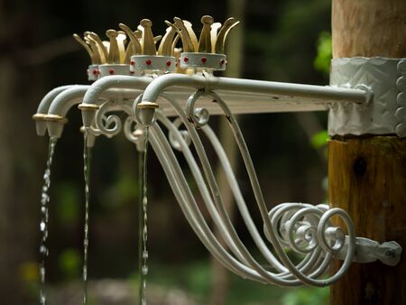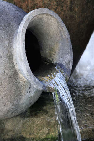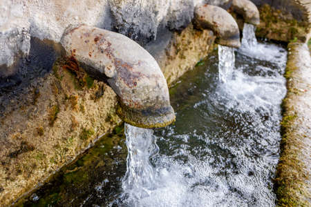 Water splashing from the fountain. Pure water flows under pressure from the tube. City fountain in the summer in the city.