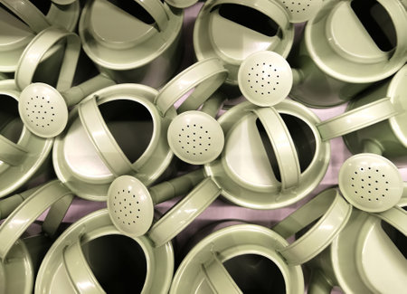 Metal watering cans for watering flowers and plants. Trade in accessories for gardeners. Many objects