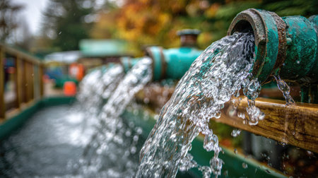 This image captures the dynamic flow of water cascading from a pipe, creating mesmerizing splashes and reflecting light. The industrial setting adds a unique atmosphere to this visual.