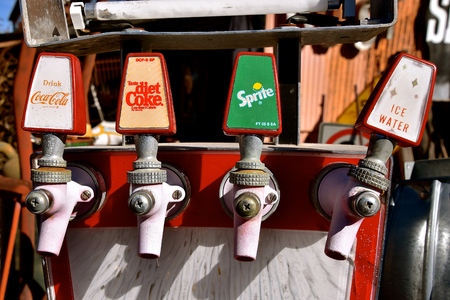 JEROME, ARIZONA, January 30, 2018: The faded Coke and Sprite spigots are products of Coca Cola, a soft drink company headquartered in Atlanta, Georgia.