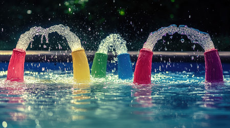 A vibrant scene featuring colorful fountain spouts spraying water into a sparkling pool, evoking joy and summer fun, perfect for leisure and relaxation themes.