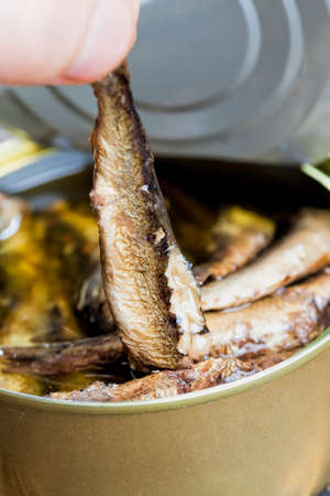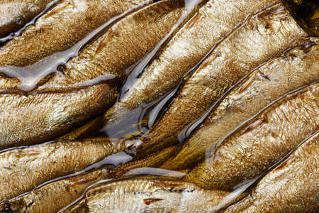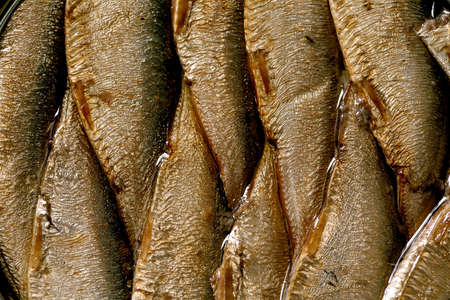 Macro close up of canned baltic smoked sprats in oil. Food background
