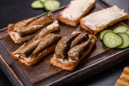 Delicious fresh sandwich with sprats with crispy toast, butter and cucumber. Quick healthy snack