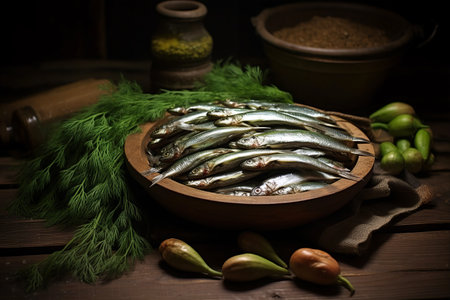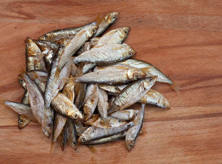 Top close view of canned smoked sprats in a stoneware bowl on an old worn cutting board.