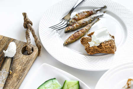 Dinner with grilled capelin fish and vegetables. White background. Top view.