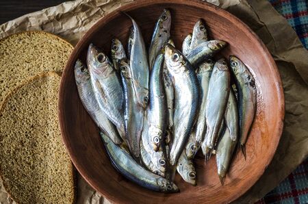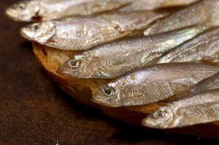 Several fish salted anchovies on a dark concrete table. Concept of small fish