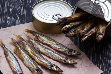 industrial open metal tin with smoked fish inside, close-up of food, small size fish
