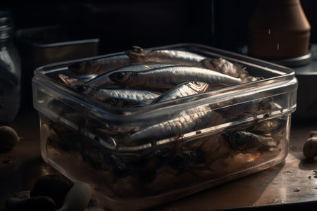 Sprats smoked fish in can. Delicious tasty seafood in tin can. Generate ai