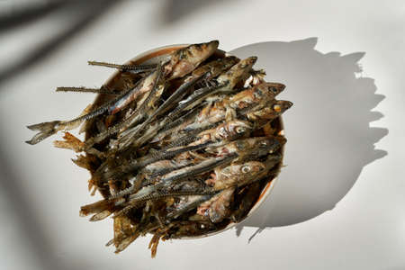 Appetizer of fried sprat and vegetables. White background. Top view.