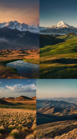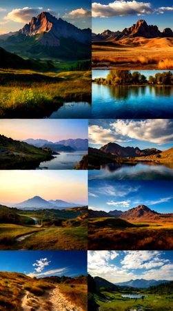 Collage of beautiful landscapes of the Caucasus mountains. Russia, Siberia.