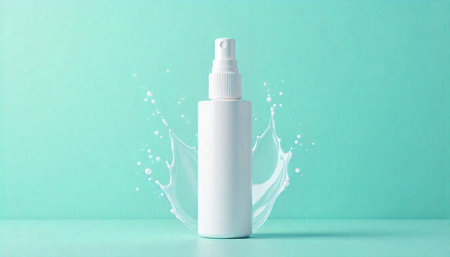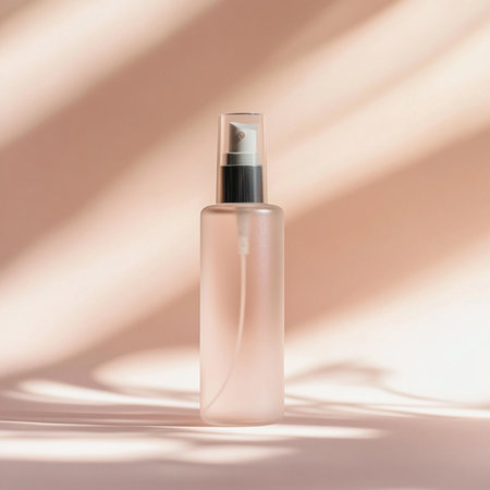 Minimalist cosmetic bottle and soft makeup brush displayed on a soothing, neutral background with delicate accents. Perfect for beauty, skincare, and self-care product promotion. The soft color palette and clean composition convey a sense of calm, elegance, and purity, ideal for luxury wellness branding or product mockups