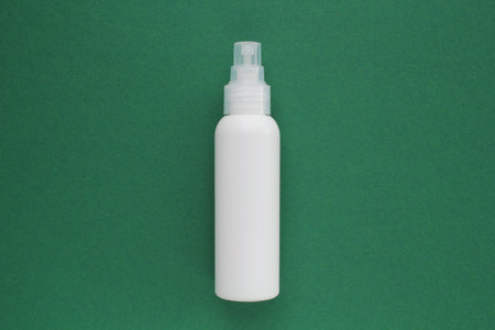 White unbranded plastic dispenser spray bottle on green background with copy space for text. Cosmetic package mockup, liquid soap flacon, hand sanitizer without label, shampoo orga