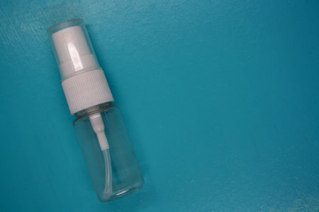 Hand sanitizer transparent bottle with spray cap at the middle of blue background. Simple flat lay with pastel paper texture. Medical concept. Stock photography.