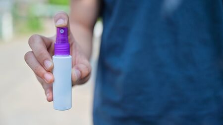 Hand a man press the alcohol spray bottle for protection and quarantine the pandemic virus on bokeh background