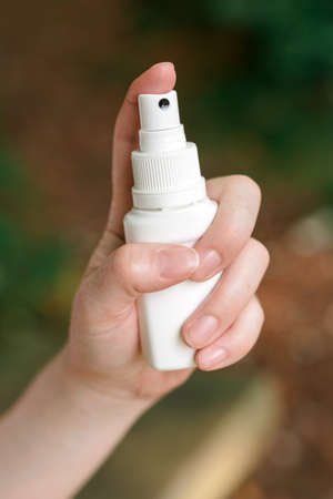 Woman using antiseptic spray outdoors in forest to protect the injury wound from infection, selective focus
