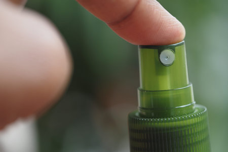Hand of woman applying alcohol spray or anti bacteria spray to prevent spread of germs, bacteria and virus. Personal hygiene concept.