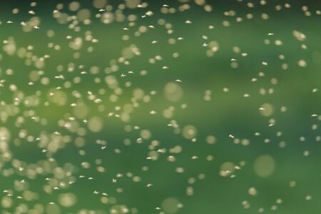 Numerous mosquitos swirling in the air at sunset create a captivating bokeh effect, with a blurred background showcasing warm colors and the enchanting atmosphere of twilight