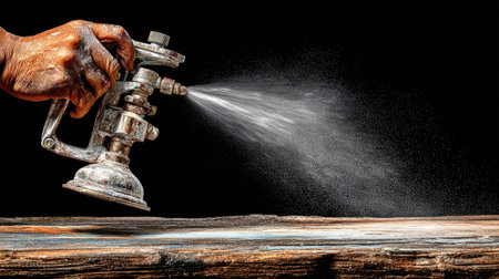Vintage spray paint machine being used, with a spray of paint in the air. The machine is resting on a wooden surface.